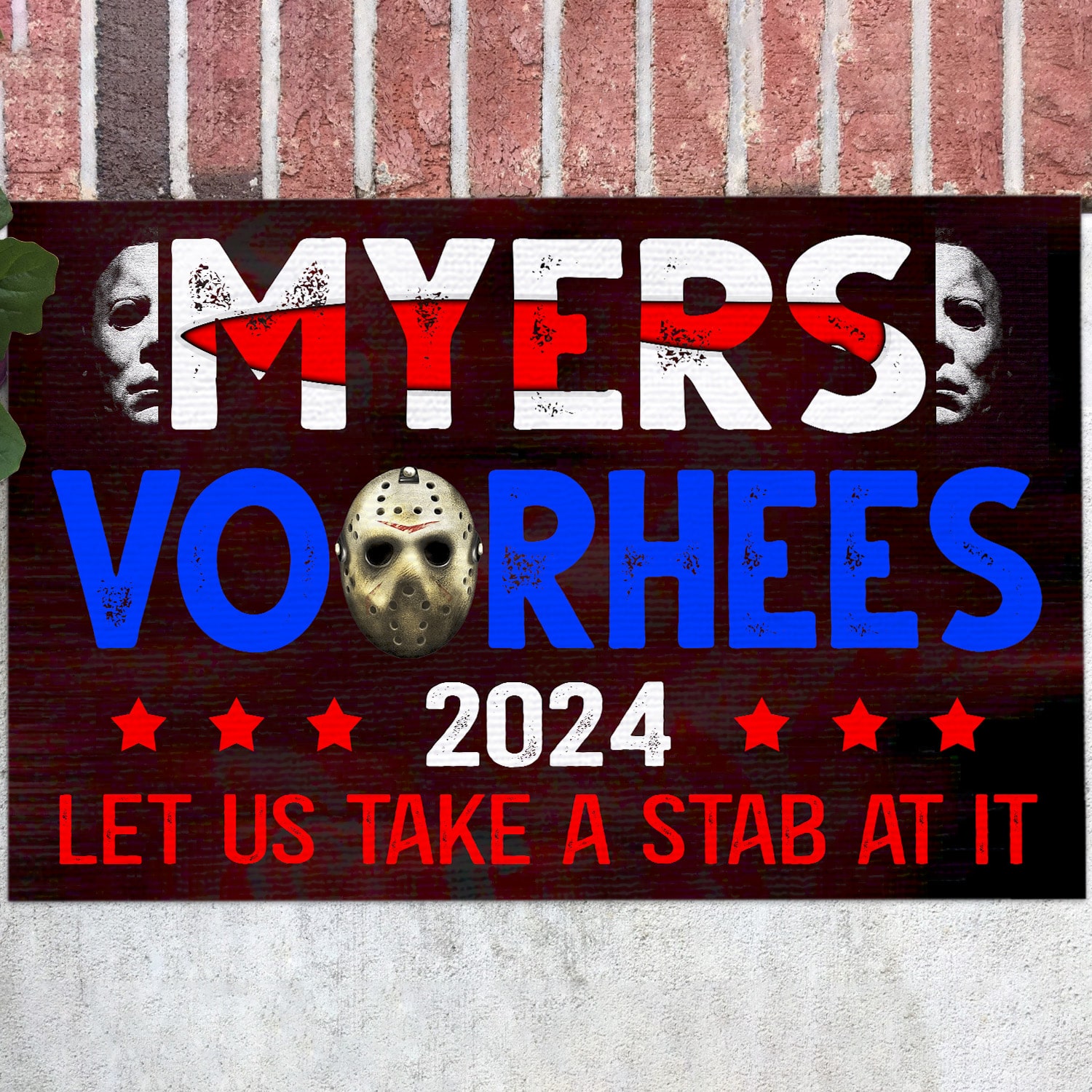 Let’s Shop Vote Michael Halloween Myers Vooheers 2024 Election Doormat – Scary Halloween Myers Voorhees Let Us Take A Stab At It Doormat!