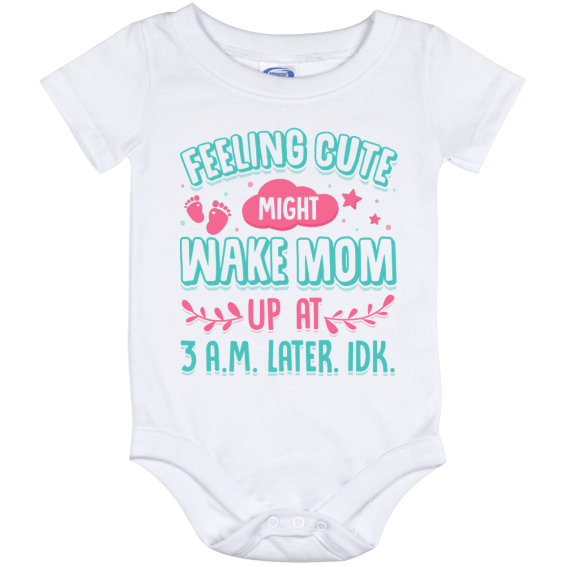 Shop Feeling Cute Might Wake Mom Up At 3AM Later IDK Funny Baby Onesie – Infant bodysuit.