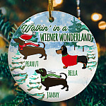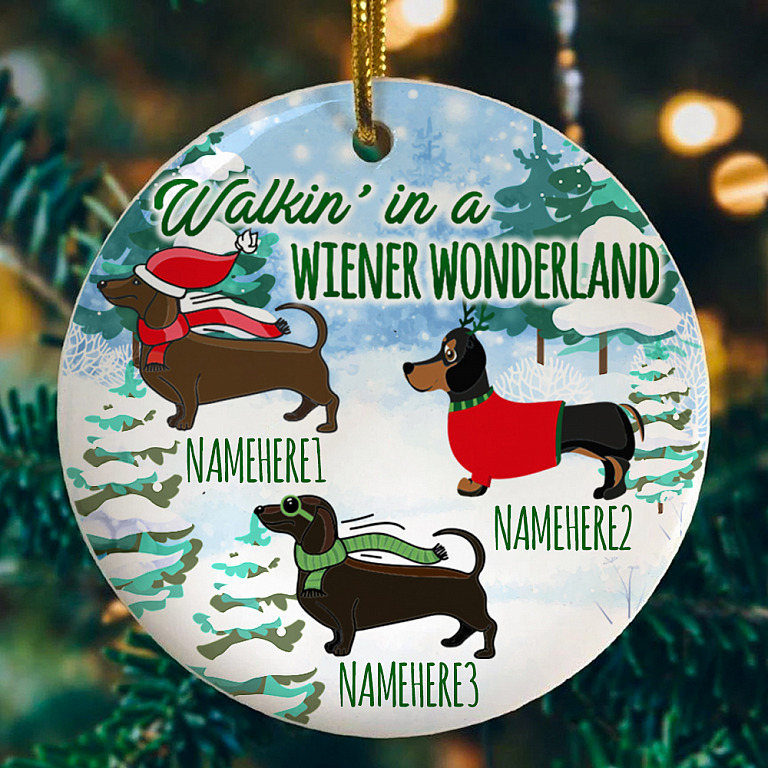 Let’s Shop Personalized Walkin’ In A Wiener Wonderland Funny Three Dachshunds Holiday Christmas Circle Ornament Keepsake!