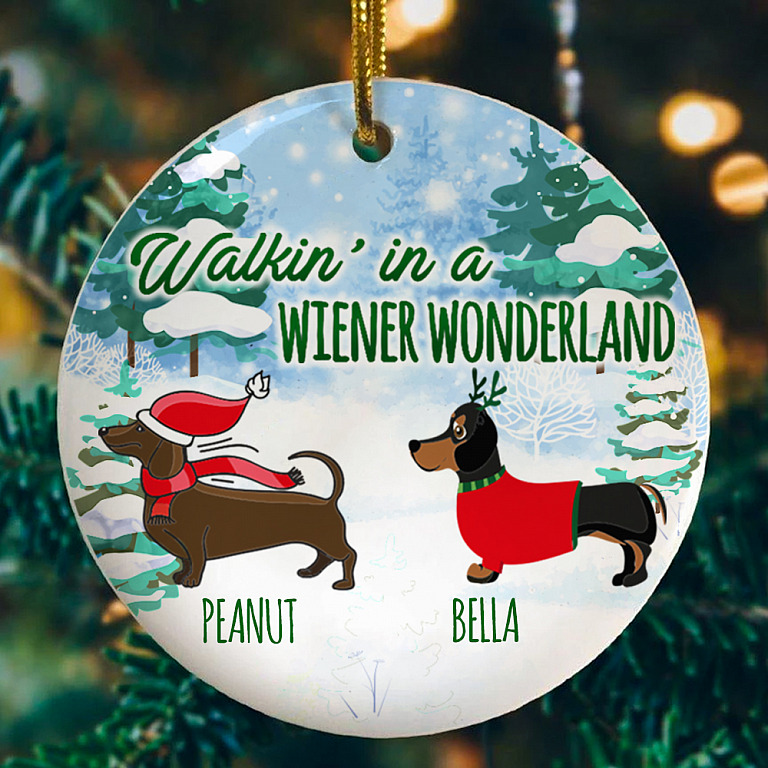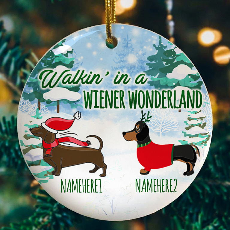 Let’s Shop Personalized Walkin’ In A Wiener Wonderland Funny Two Dachshunds Holiday Christmas Circle Ornament Keepsake!