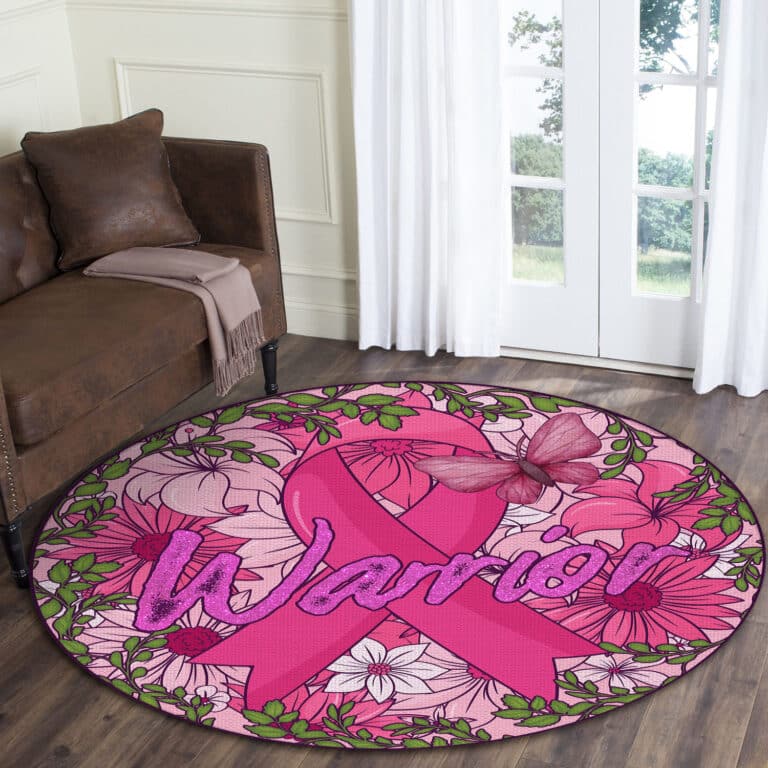 Let’s Shop Warrior Cancer Awareness Pink Ribbon Round Rug – Breast Cancer Support Indoor Mat Gifts!
