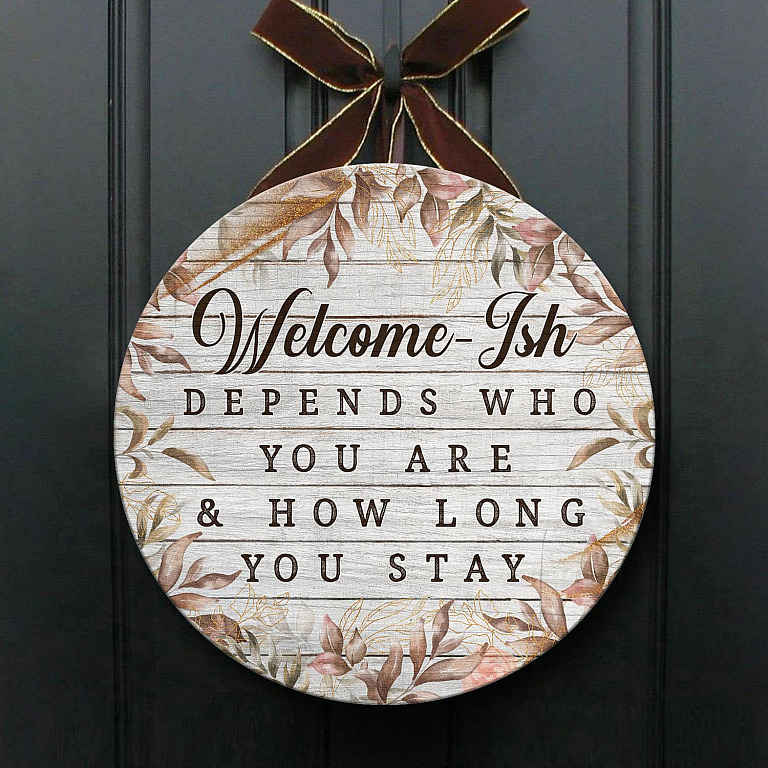 Let’s Shop Welcome-ish Depends Who You Are And How Long You Stay Wooden Door Sign – Front Porch Sign Indoor Outdoor Decor!