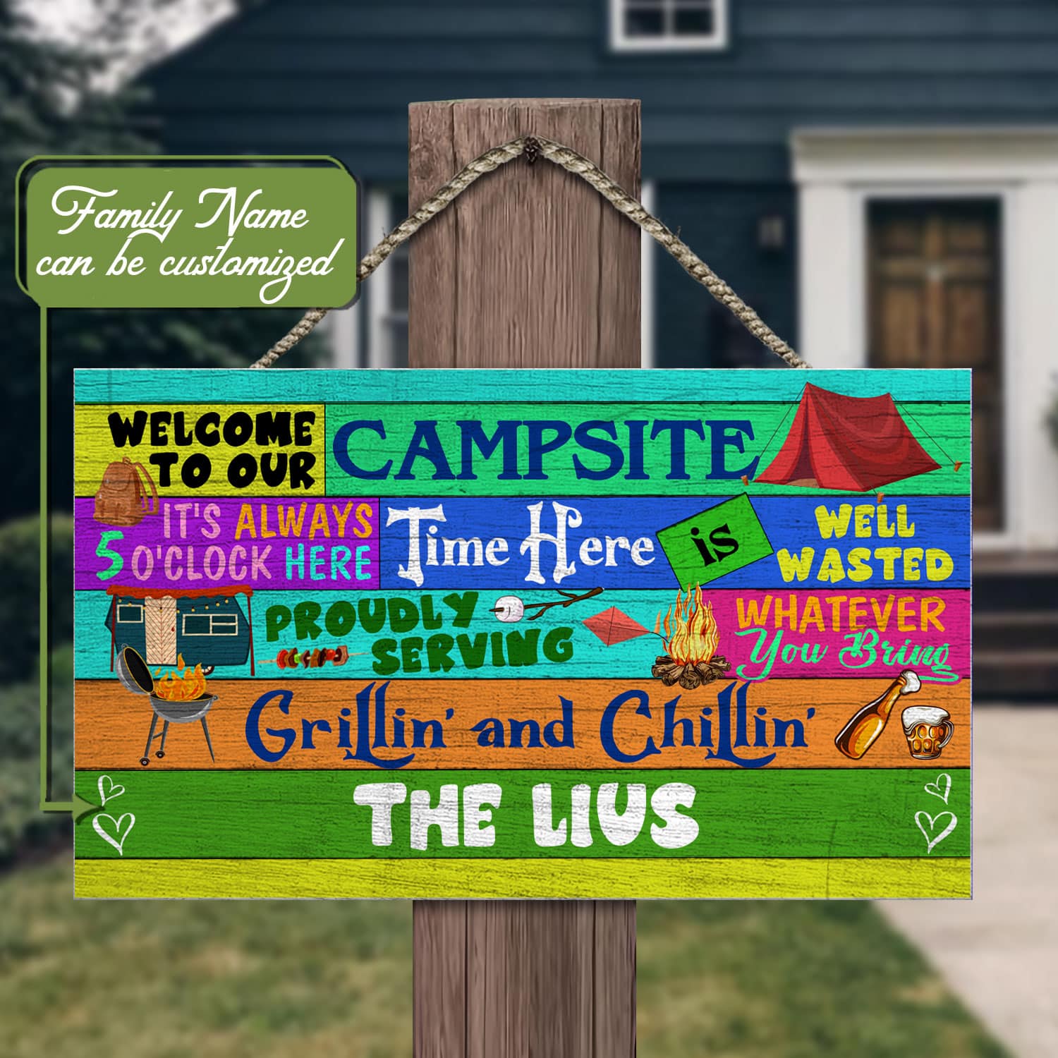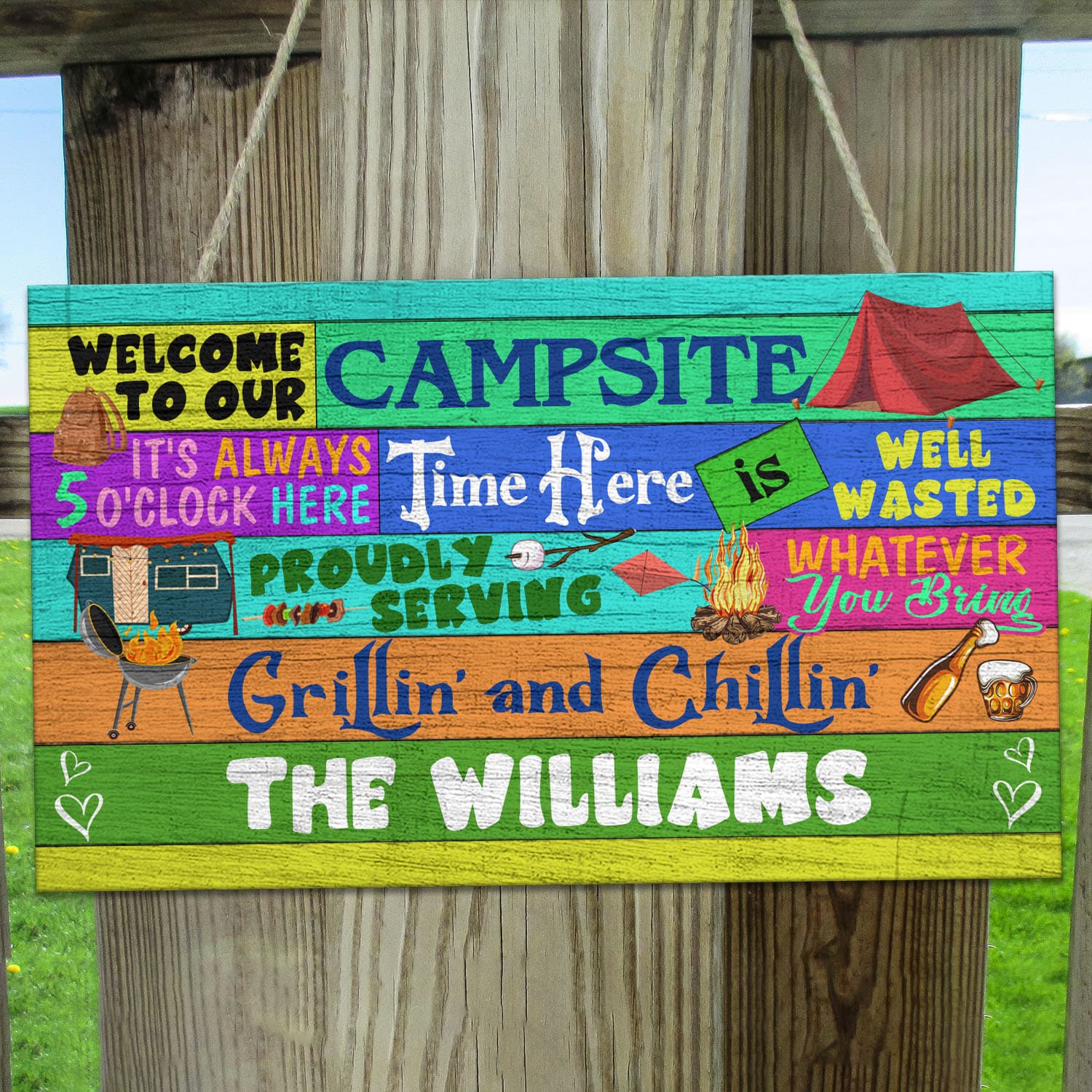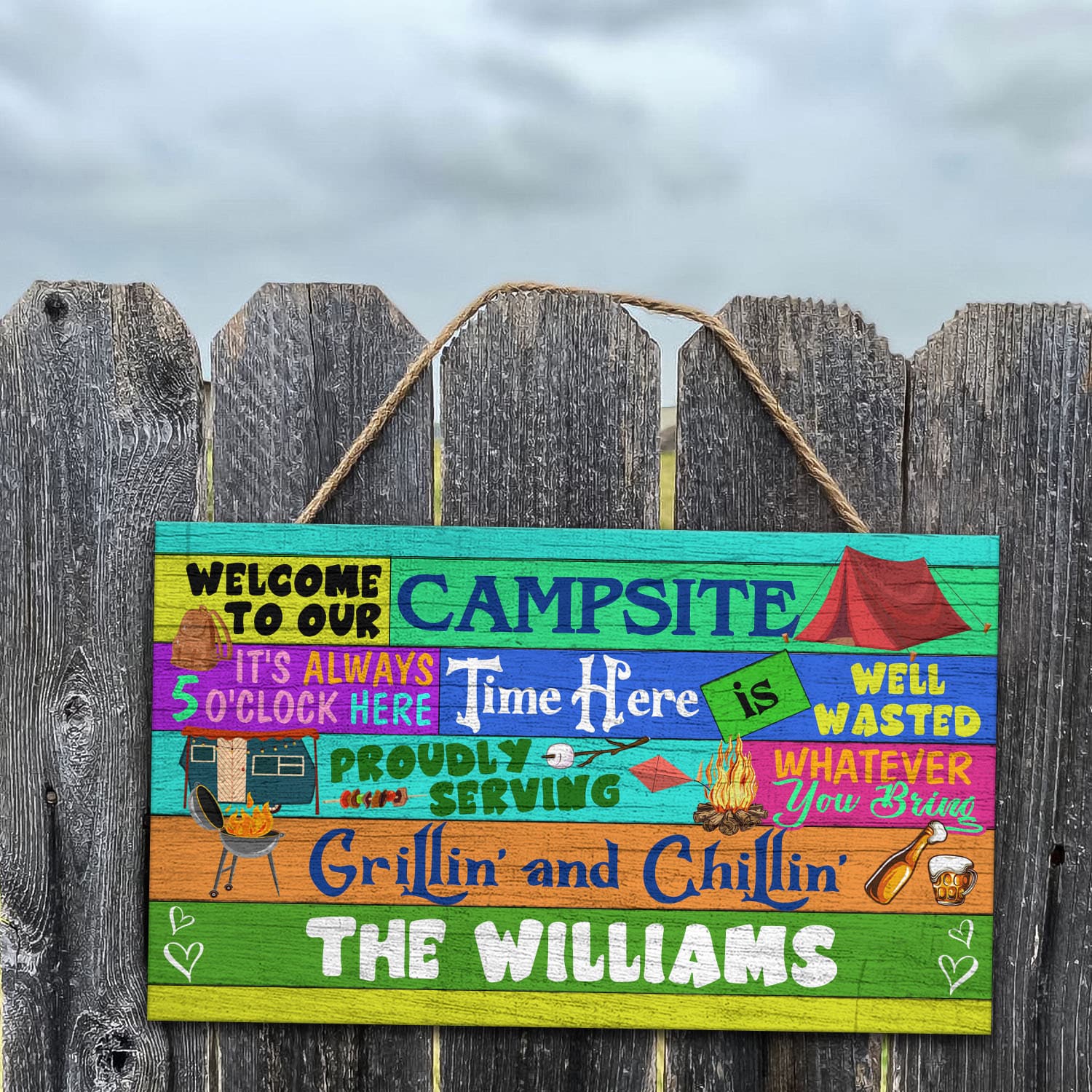 Let’s Shop Personalized Welcome To Our Campsite It’s Always 5 O’clock Here Rectangle Wooden Door Sign – Front Porch Sign Outdoor!