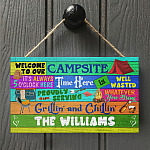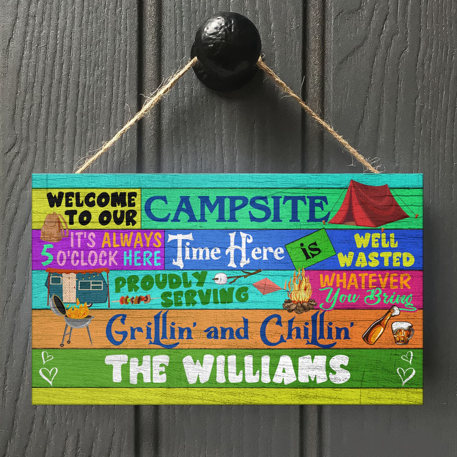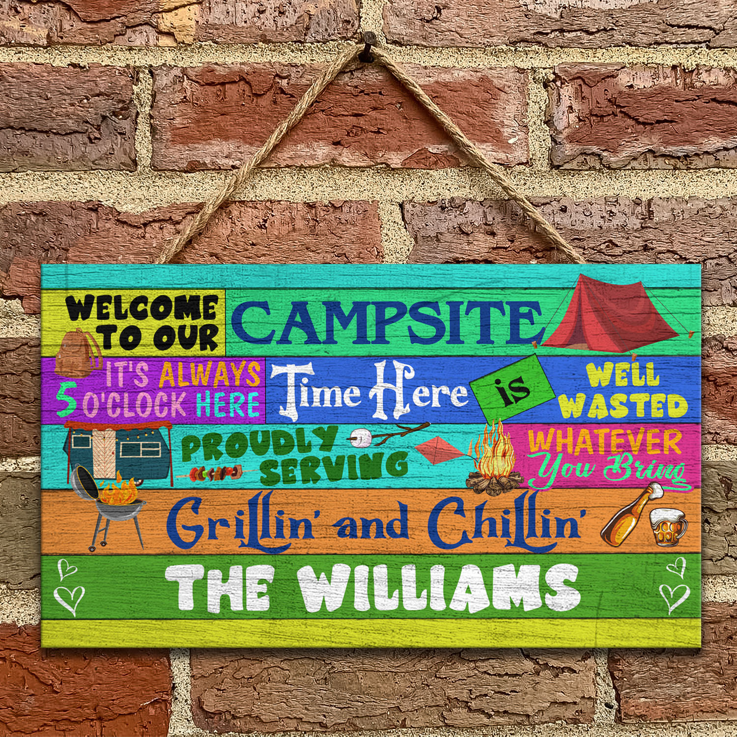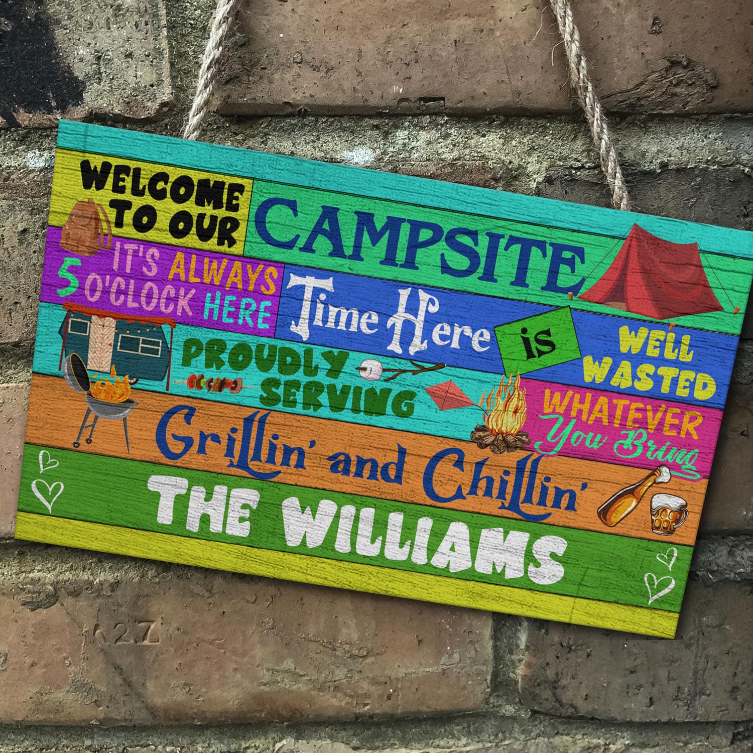 Let’s Shop Personalized Welcome To Our Campsite It’s Always 5 O’clock Here Rectangle Wooden Door Sign – Front Porch Sign Outdoor!
