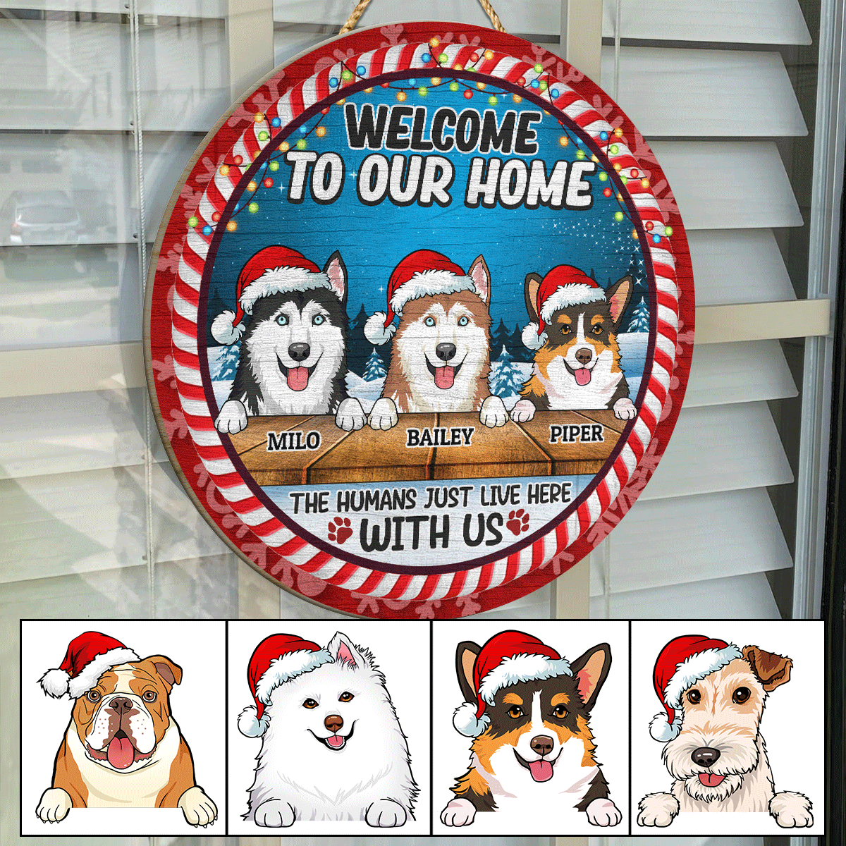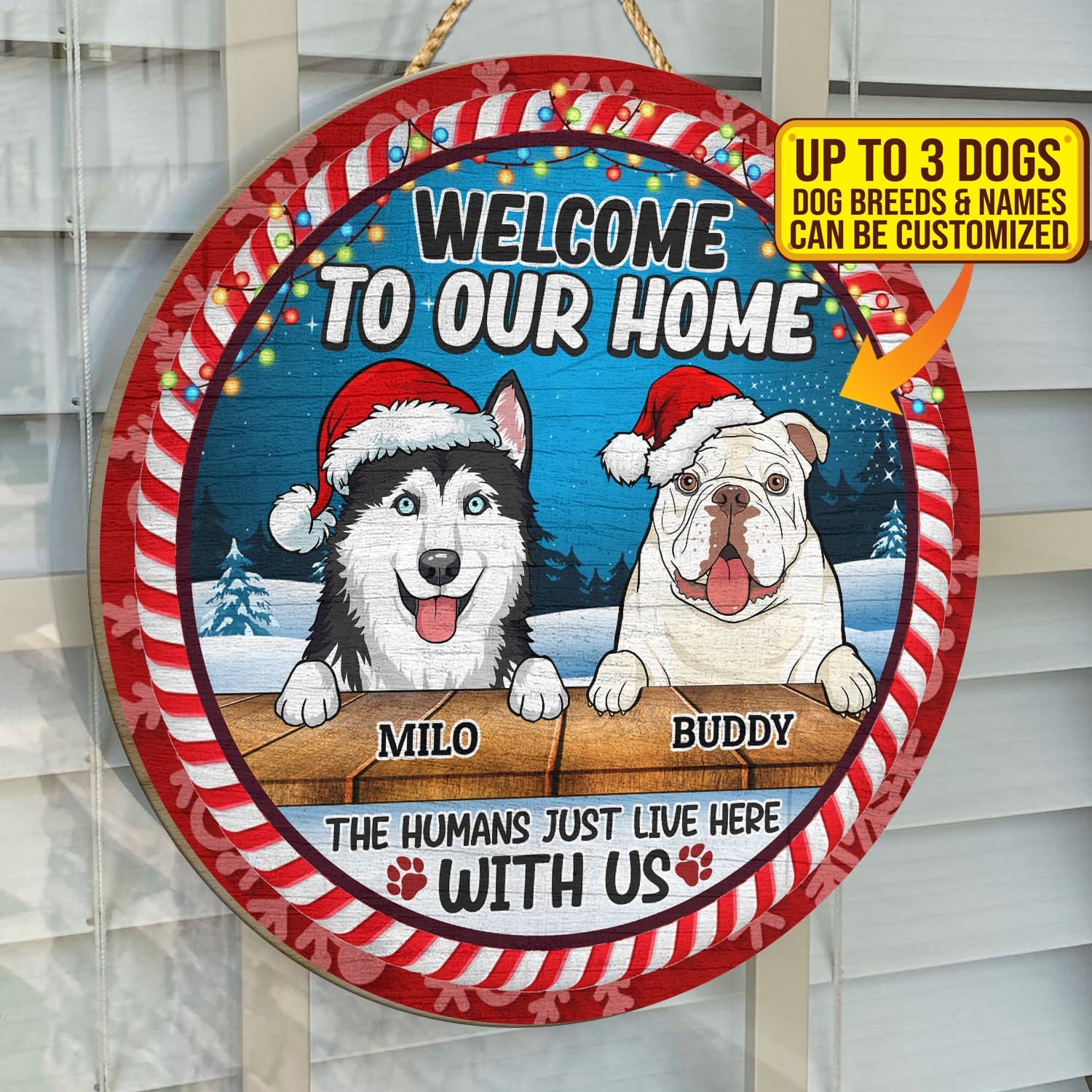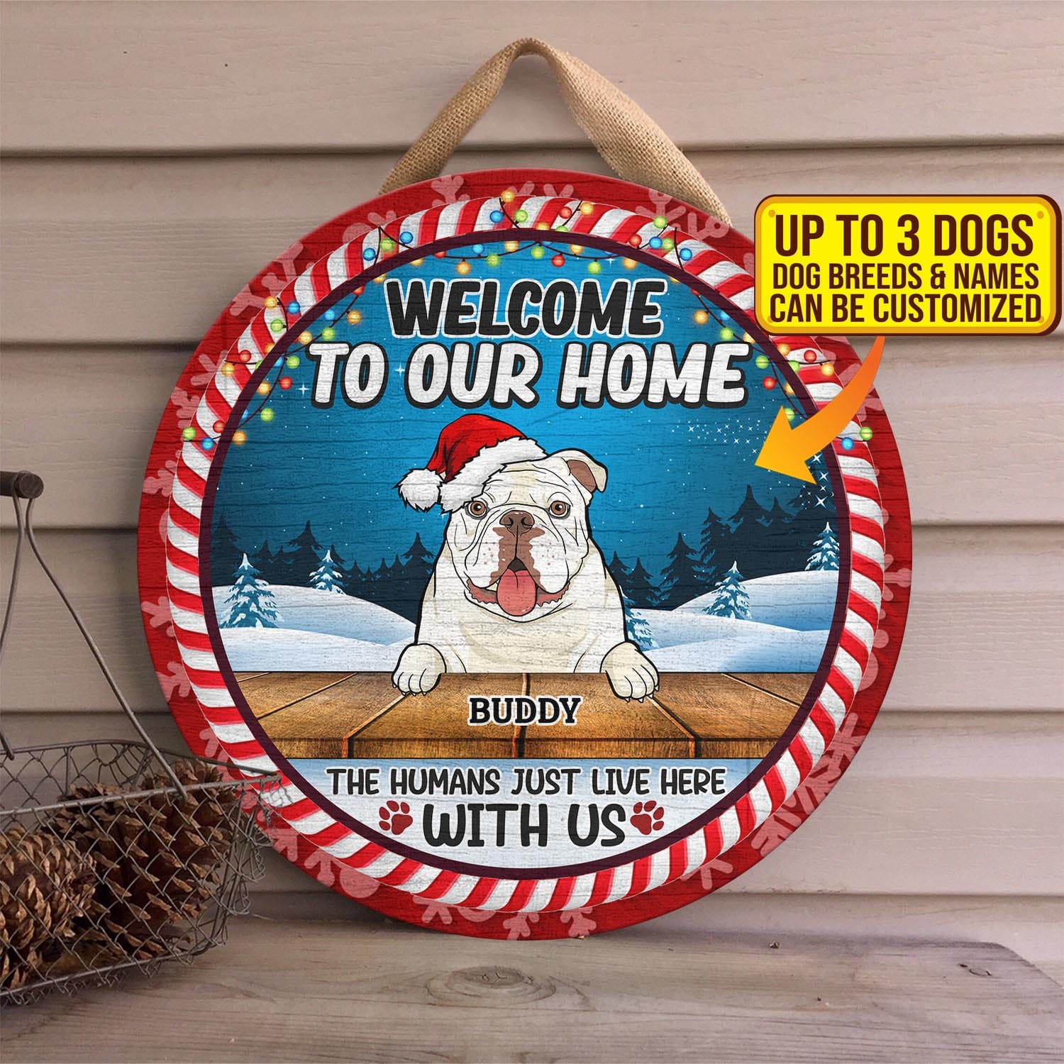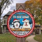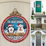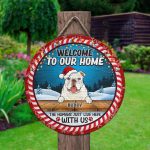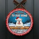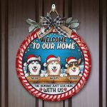 Let’s Shop Welcome to Our Home Funny Dogs Personalized Decorative Circle Wooden Door Sign – The Humans Just Live Here with Us Custom Christmas Sign!