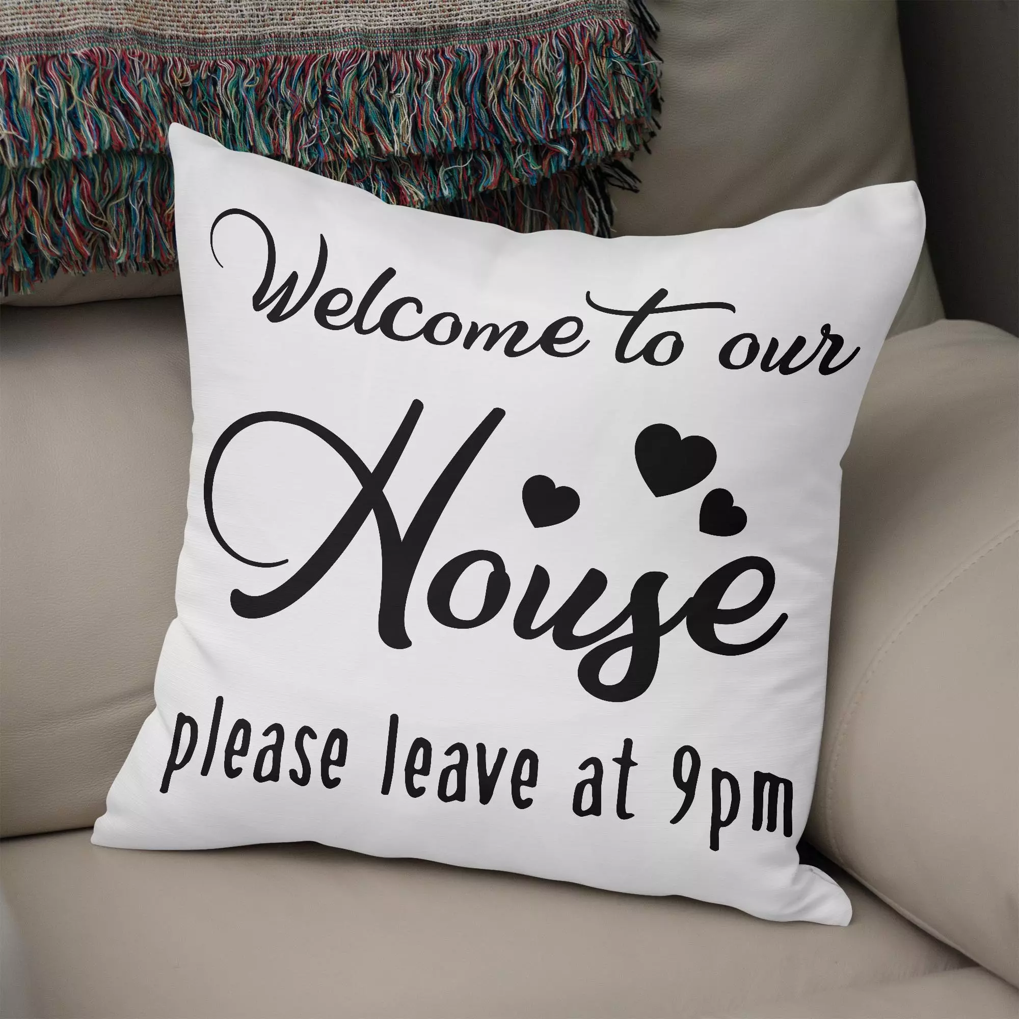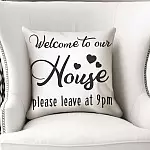 Welcome To Our Home Please Leave By 9 Pm Throw Pillow – Decorative Pillow – Indoor Outdoor Cushion – Sofa Home Decor
