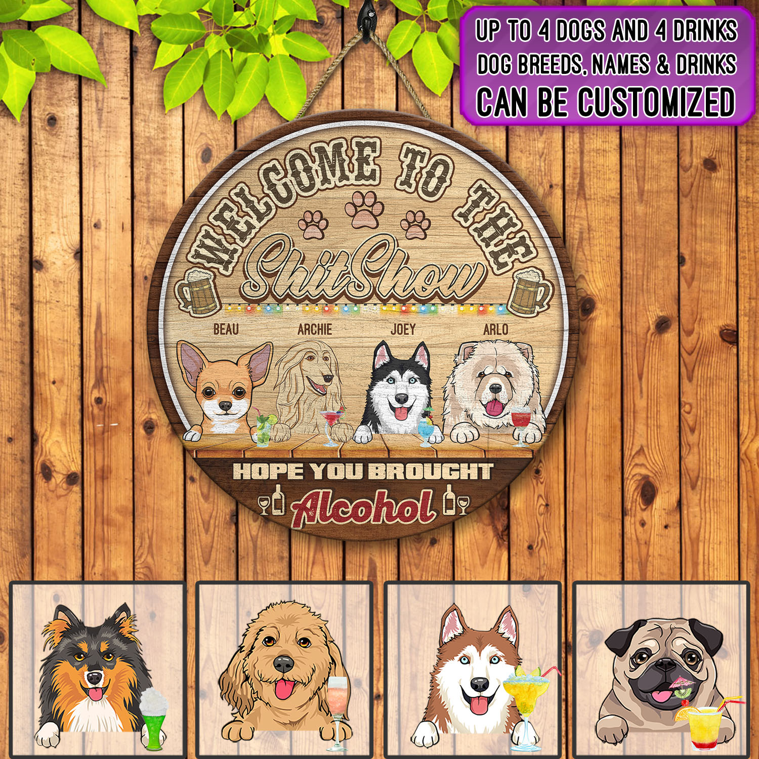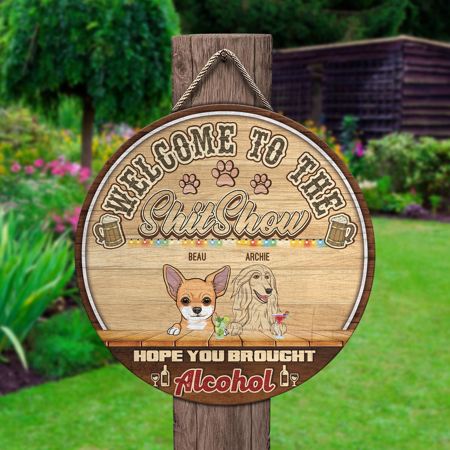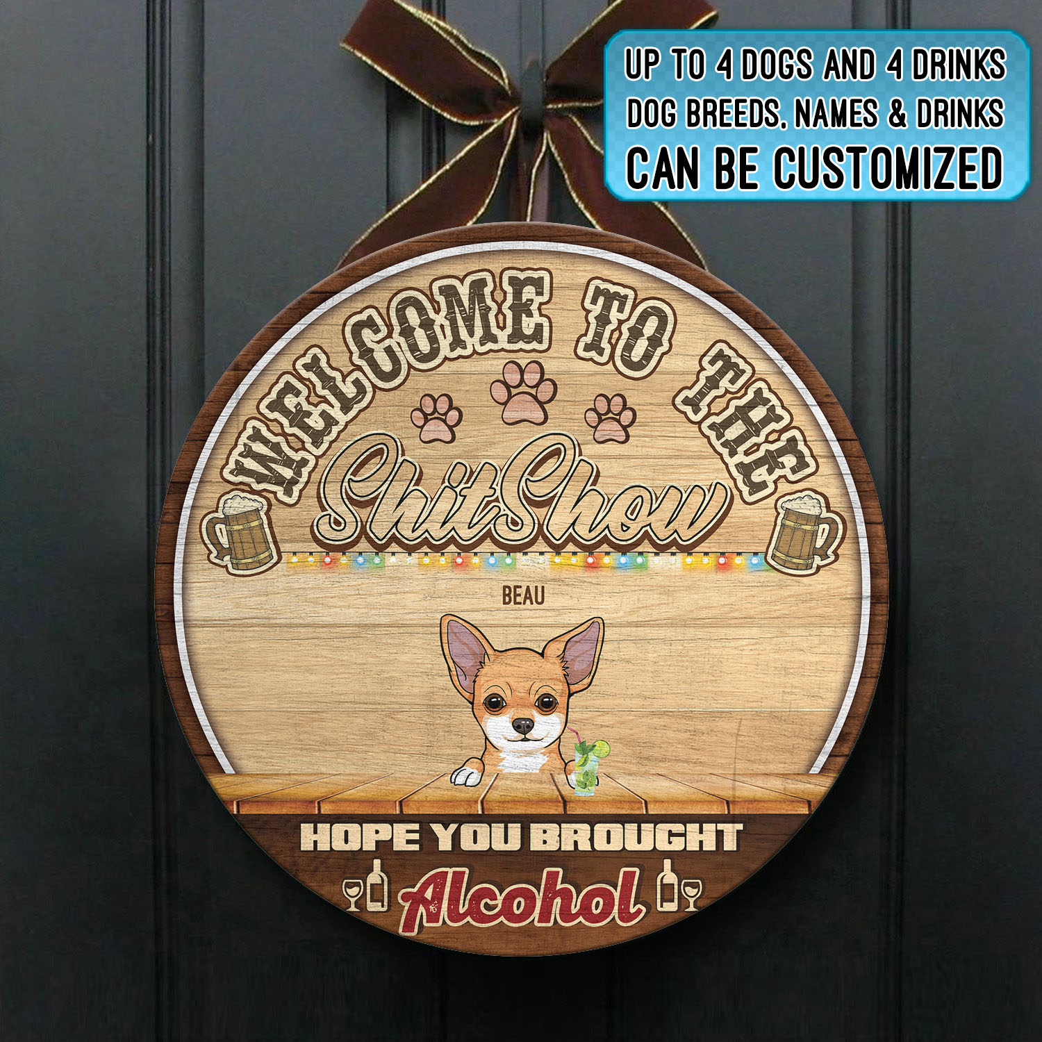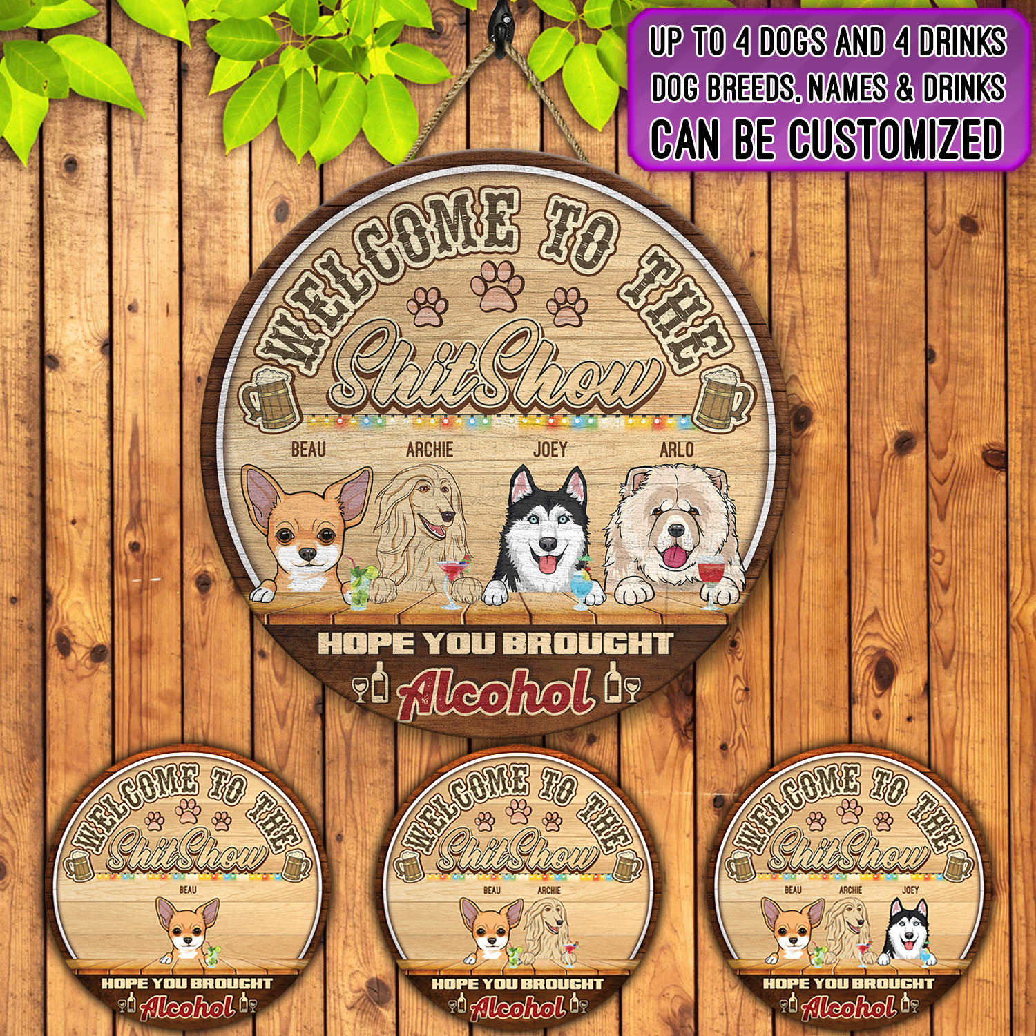 Let’s Shop Welcome to The Shitshow Personalized Dog Breed Decorative Circle Wooden Door Sign – Funny Drinking Dogs Front Porch Signs!