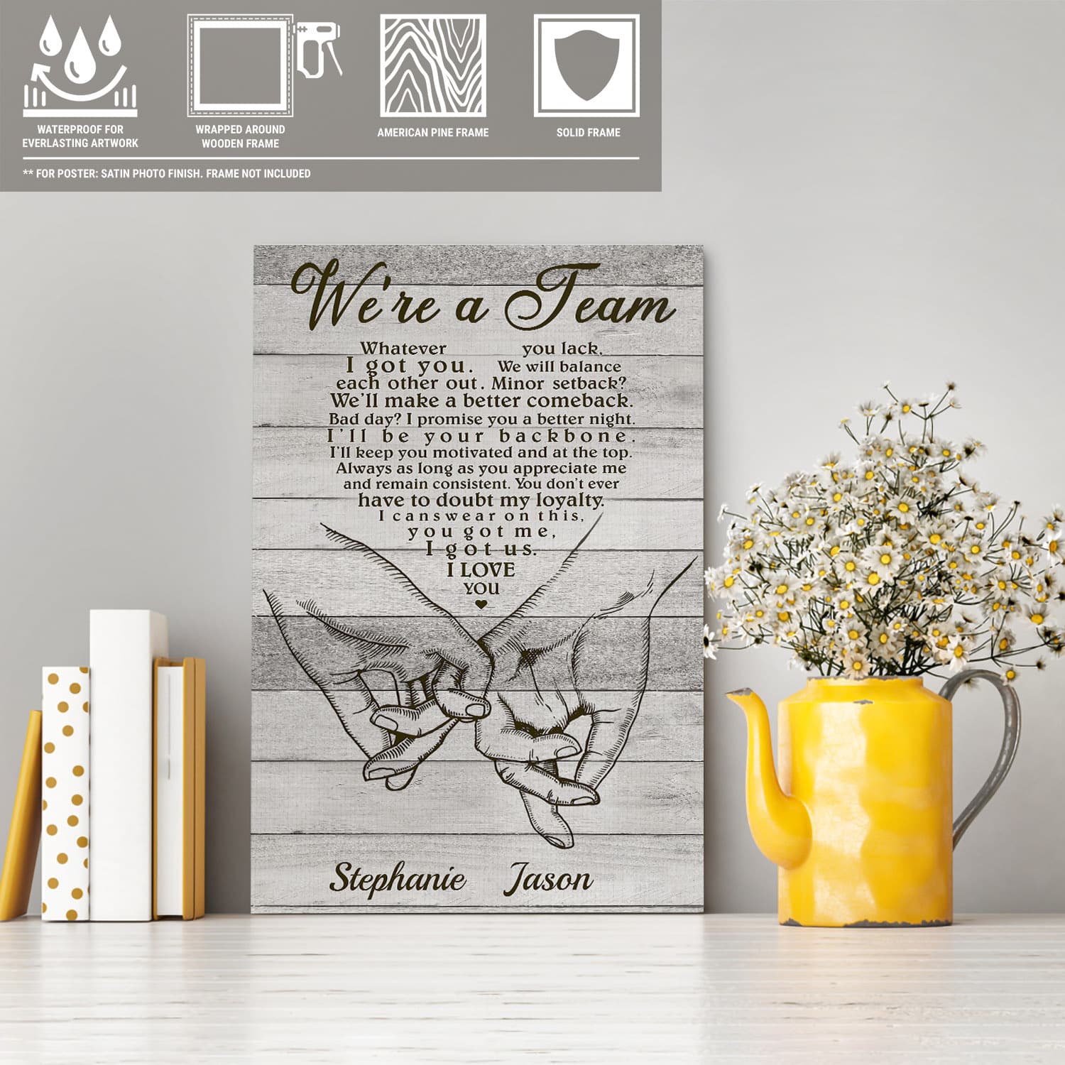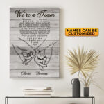 Are you spending too much time to find creative merchandise for you or suitable & special gifts for your mommy, your daddy, your son, your daughter, your children, your friends or someone you love? The struggle is over because we have various We’re a Team Canvas, We’re a Team Wall Art, We’re a Team – Couple Having Date Custom – Canvas, We’re a Team – Couple Having Date Custom – Personalize Canvas, Couple Gift, We’re a Team Poster, We Are a Team Holding Hands, Holding Hands Art which will make perfect presents for your beloveds. In order to make your present stand out, we have created lots of unique and awesome customized photo gifts & personalized designs.