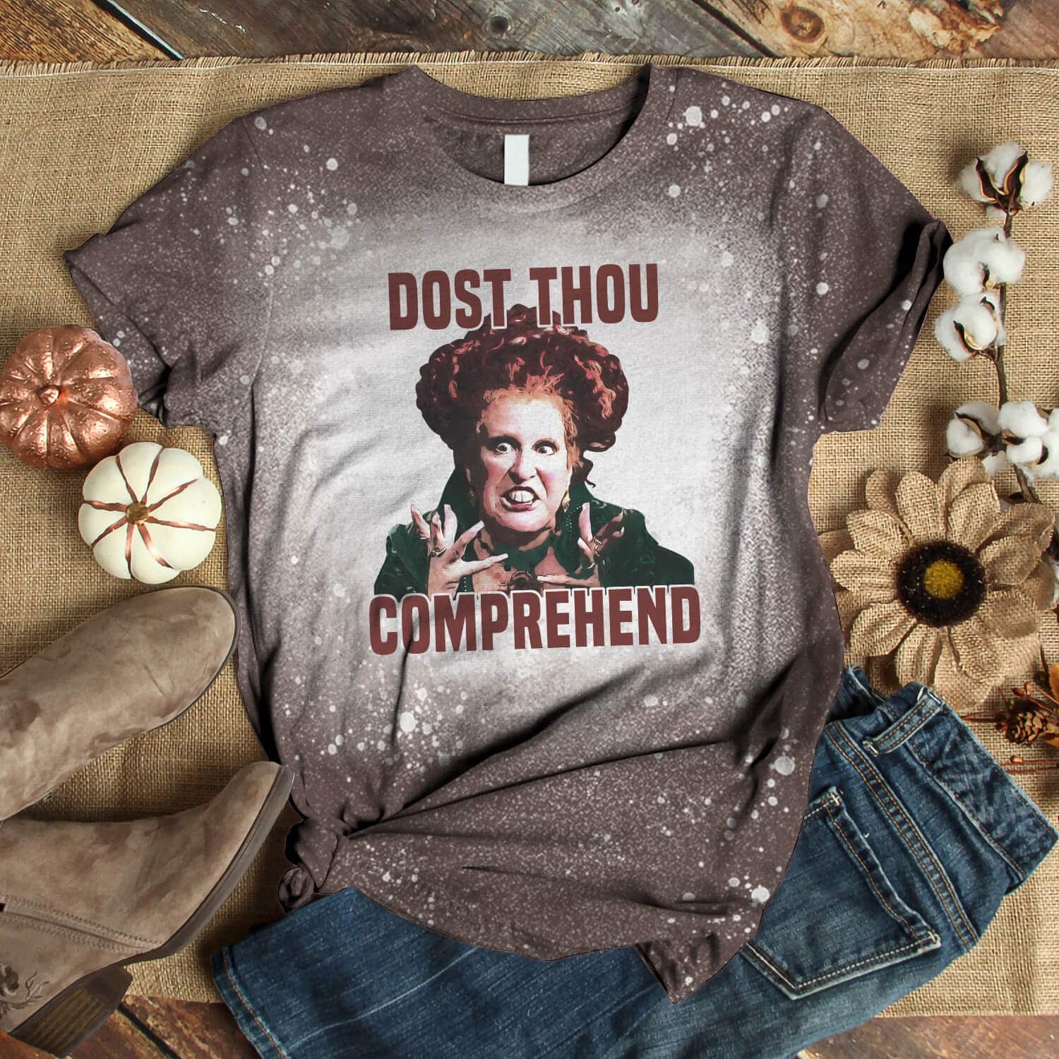 Dost Thou Comprehend Hocus Pocus Sublimation Bleached T-Shirt – Halloween Sanderson Sisters Bleached Shirt