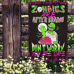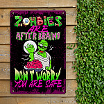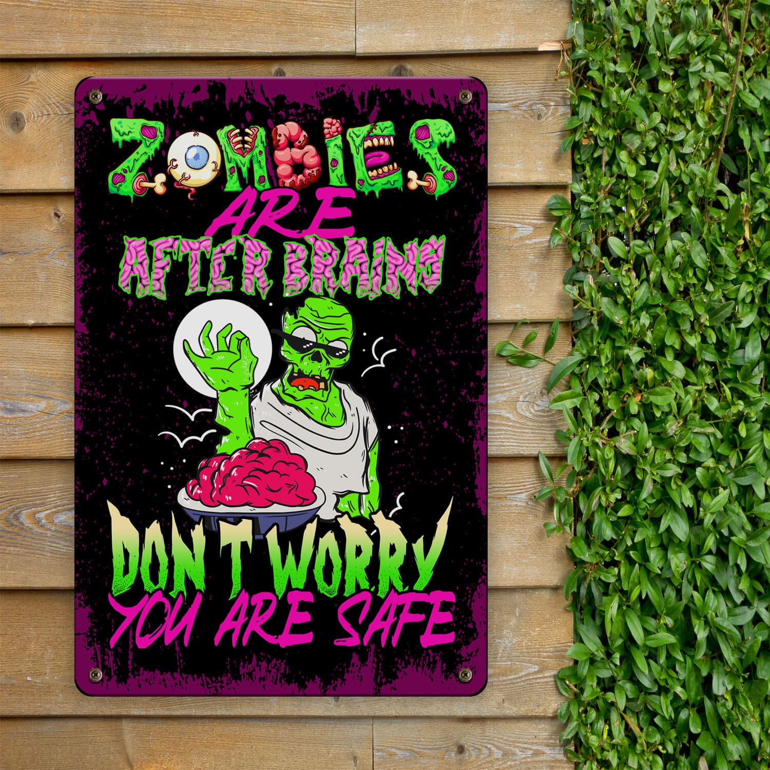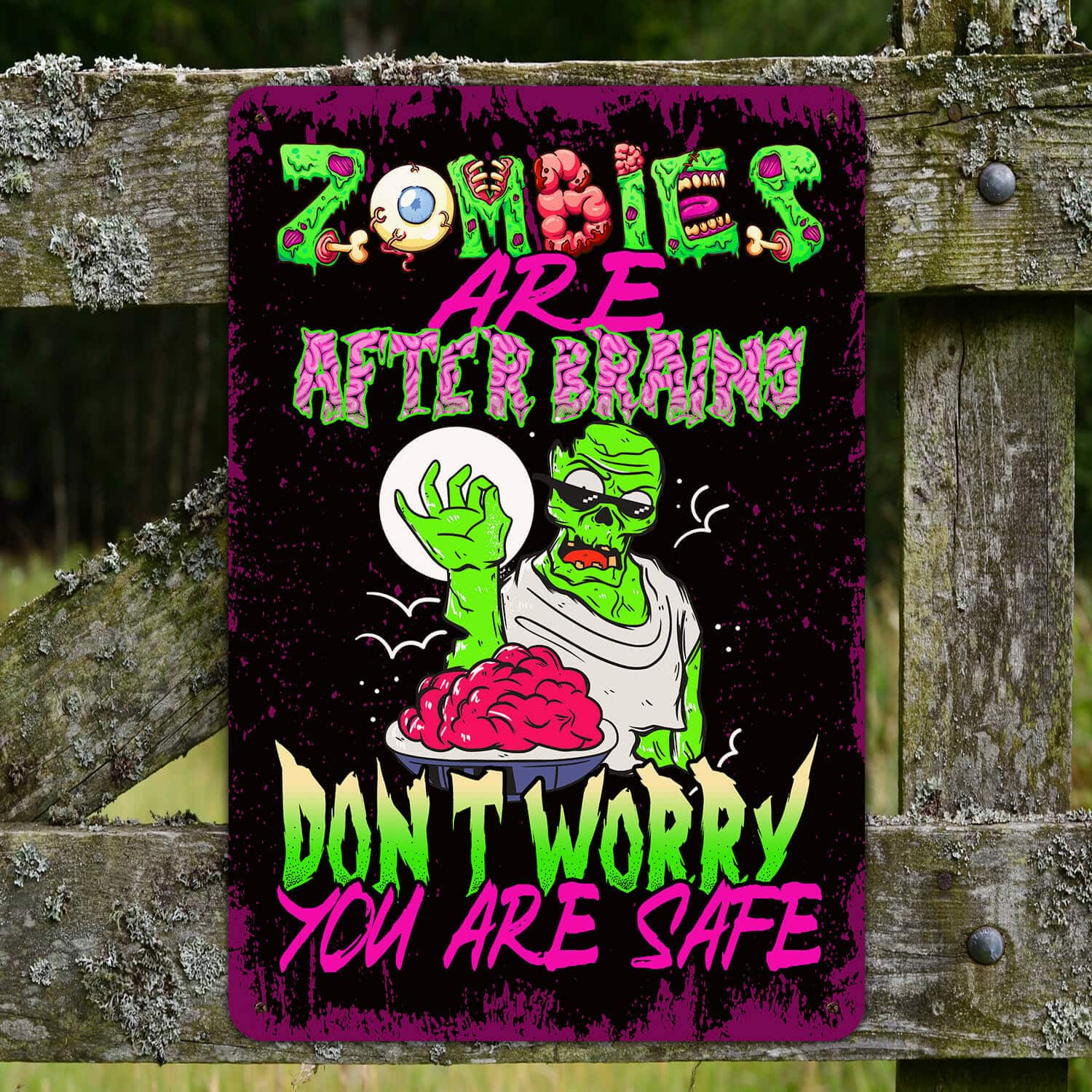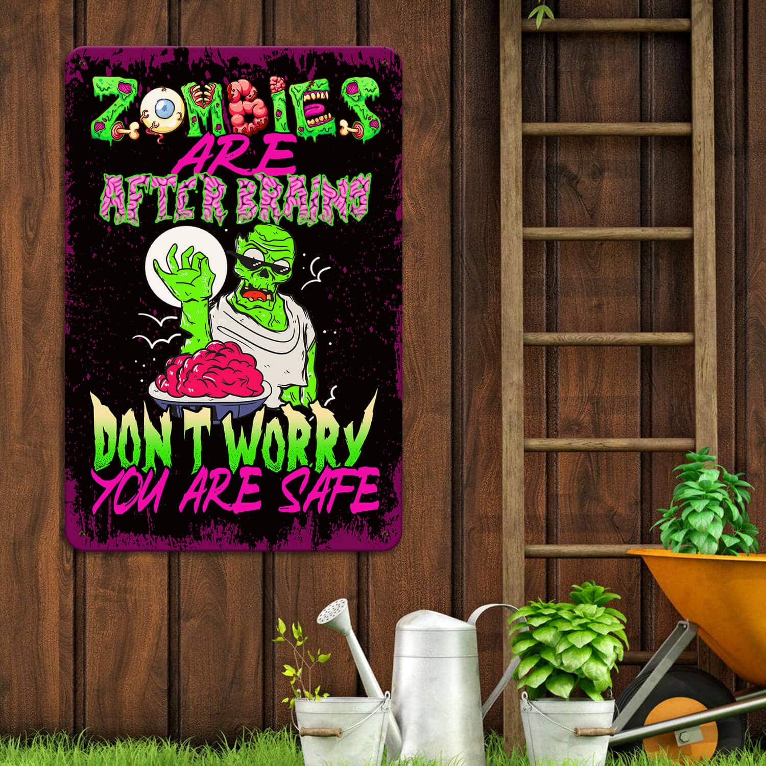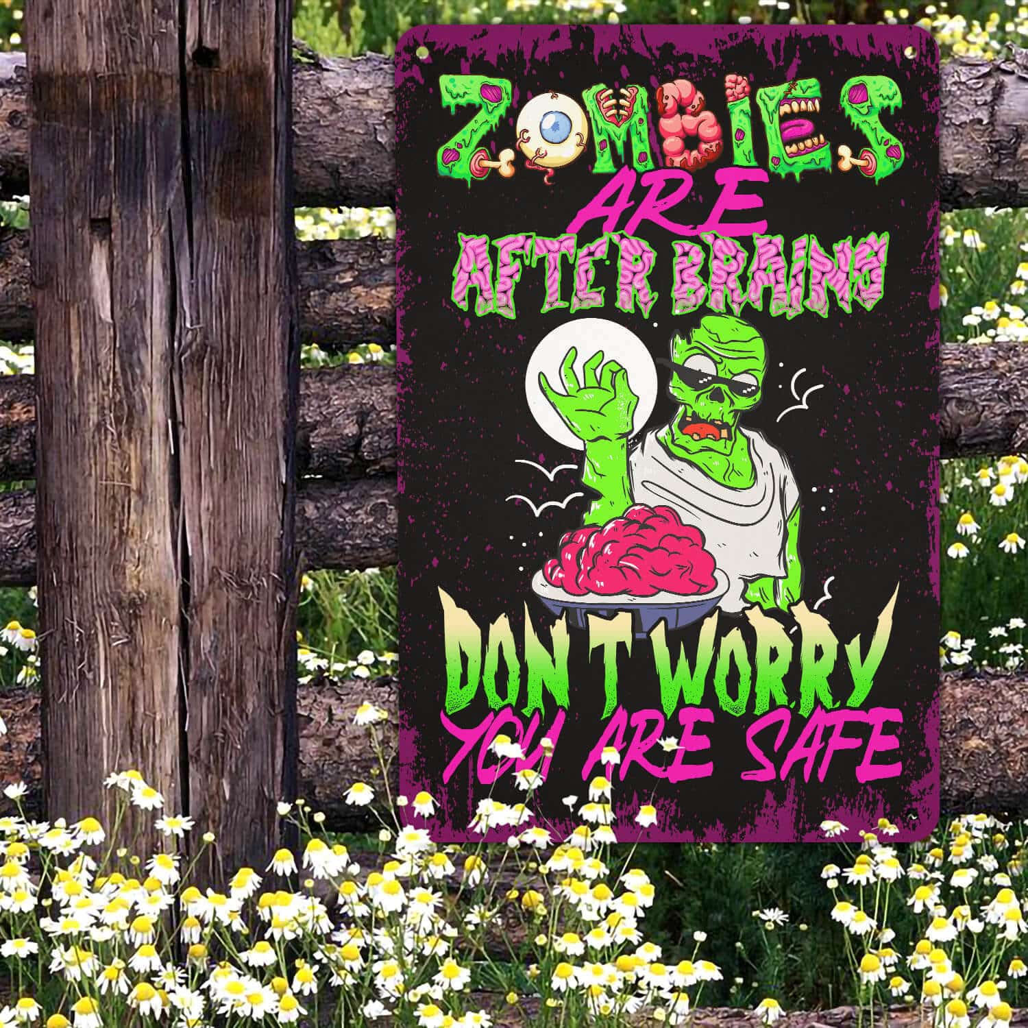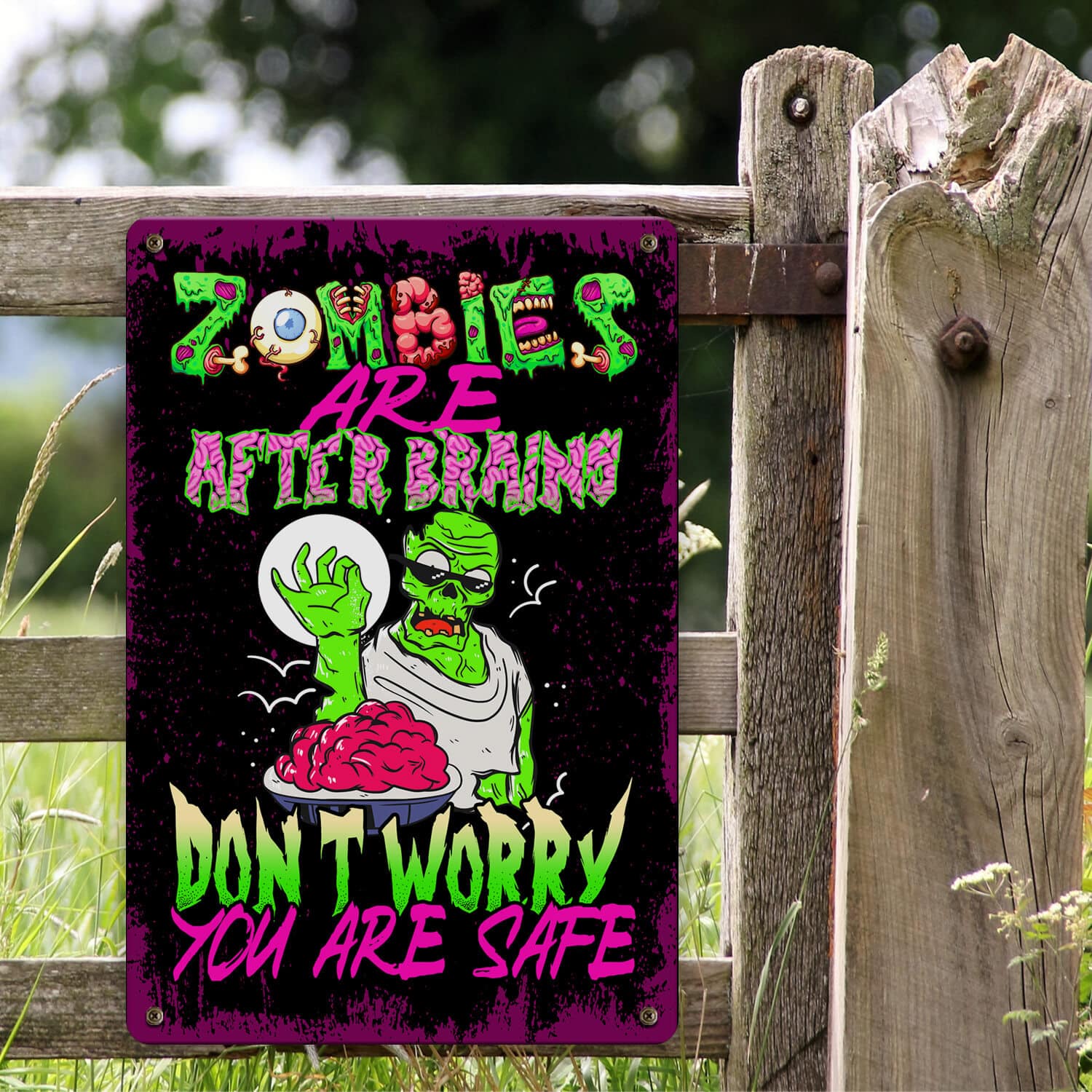 Let’s Shop Zombies Are After Brains Don’t Worry You’re Safe Metal Sign – Halloween Zombie Indoor Outdoor Decor!
